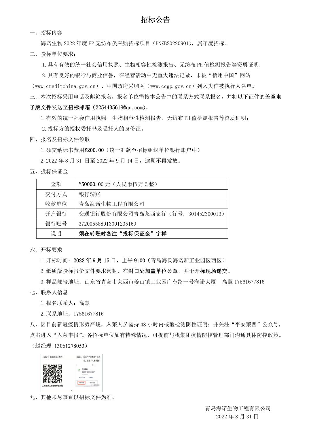 2022年度海诺生物PP无纺布类采购招标正式开始,届时我们将秉承公正、公平、公开、透明的招标原则,期待优秀供应商的广泛参与。具体招标细节如下: